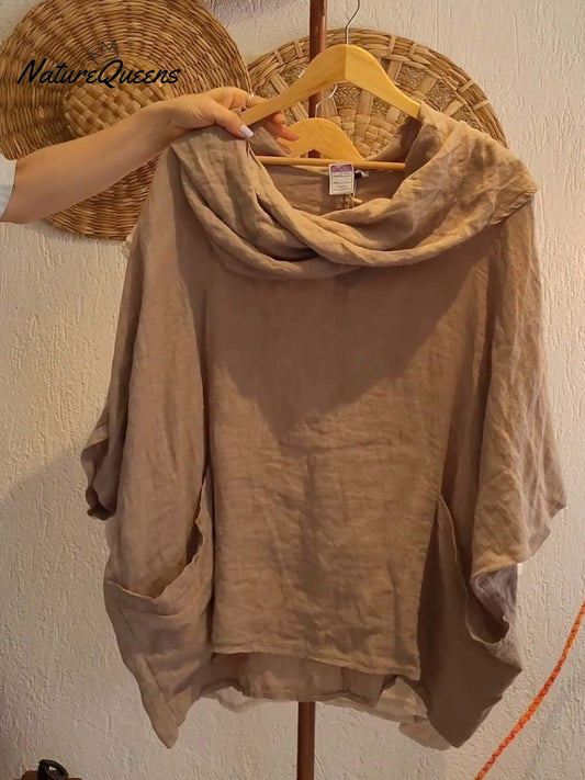 Women's Solid Color Draped Neck 3/4 Sleeve Comfortable Casual Linen Pocket Top