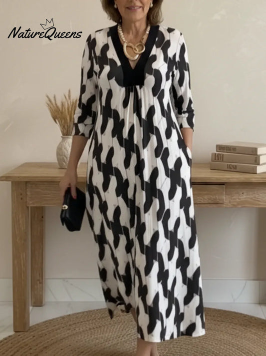 Elegant Art Print Color Block Trim V-neck Midi Dress